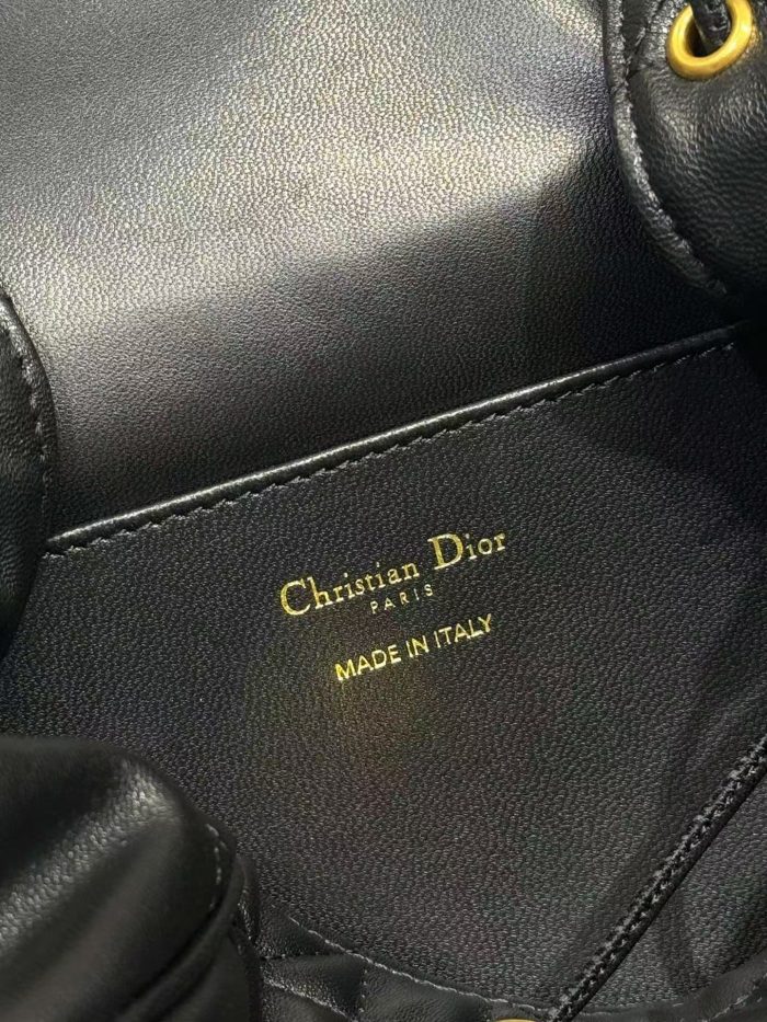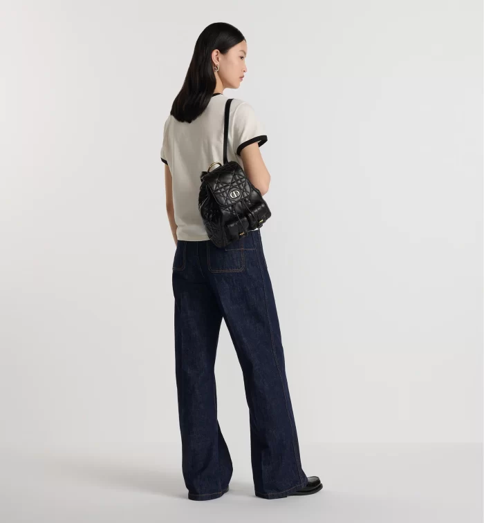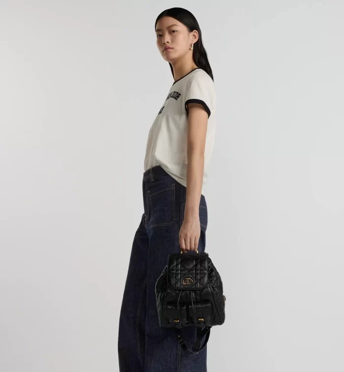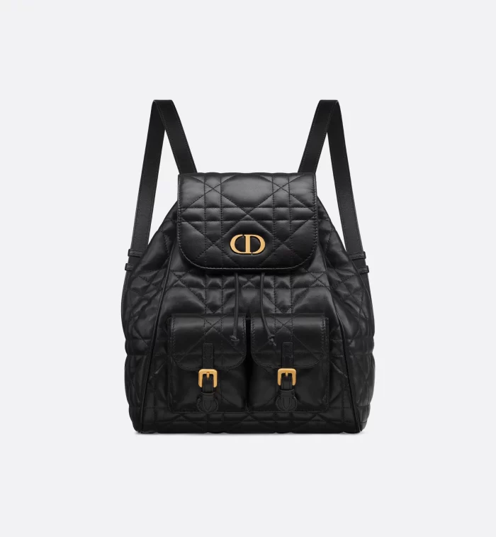 New for Cruise 2025, the Dior Caro backpack embodies modern and elegant style. Crafted in black lambskin elevated by Macrocannage topstitching, the design features a flap adorned with an antique gold-finish metal CD signature that opens to reveal a spacious drawstring main compartment, while two small flap pockets can hold all the small essentials. The medium backpack has a gold-finish handle and adjustable straps for added comfort.