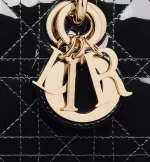 The Lady D-Joy bag captures the House’s vision of elegance and beauty by showcasing the iconic streamlined aesthetic of the Lady Dior line. Crafted in black patent calfskin with Cannage stitching, the legendary quilted texture is immediately recognizable. Pale gold-finish metal D.I.O.R. charms embellish and illuminate its silhouette. Featuring one removable chain strap and another adjustable and removable leather strap, the small Lady D-Joy bag can be carried by hand, worn over the shoulder or crossbody as a daily companion.