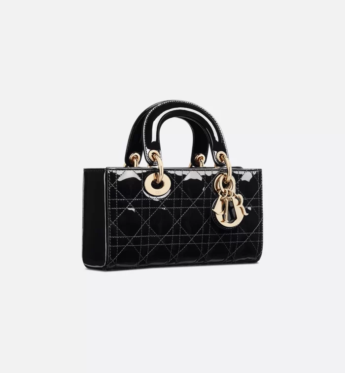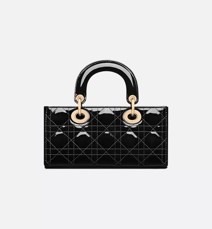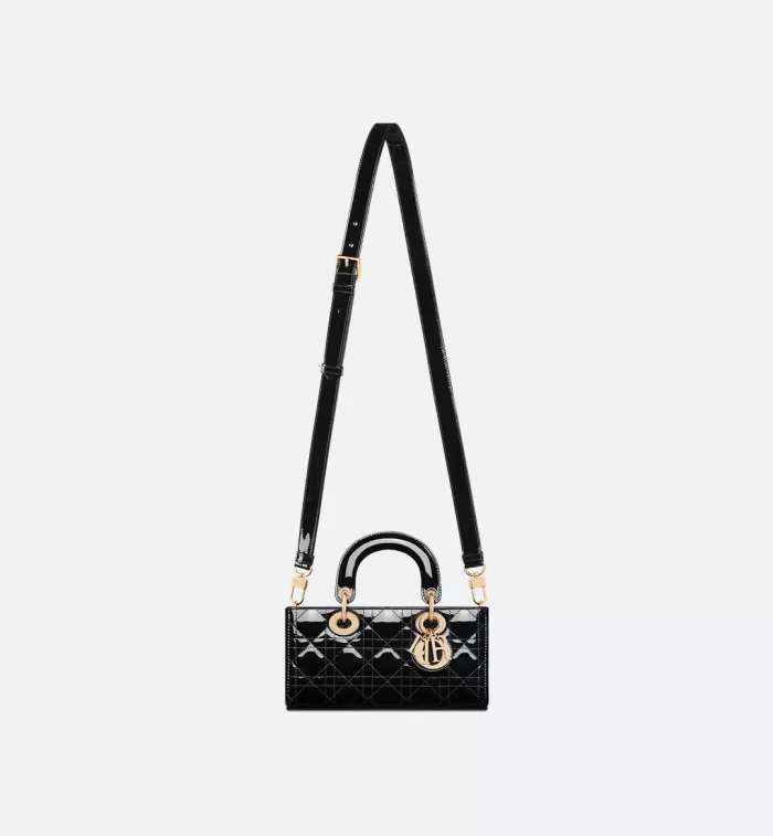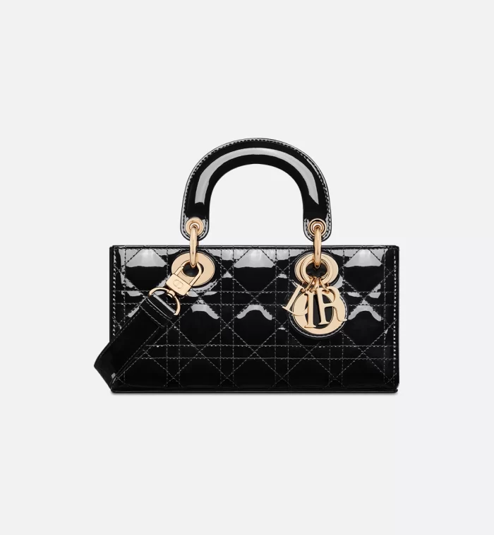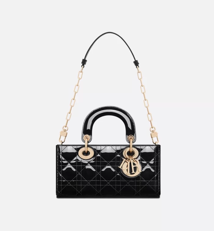 The Lady D-Joy bag captures the House’s vision of elegance and beauty by showcasing the iconic streamlined aesthetic of the Lady Dior line. Crafted in black patent calfskin with Cannage stitching, the legendary quilted texture is immediately recognizable. Pale gold-finish metal D.I.O.R. charms embellish and illuminate its silhouette. Featuring one removable chain strap and another adjustable and removable leather strap, the small Lady D-Joy bag can be carried by hand, worn over the shoulder or crossbody as a daily companion.
